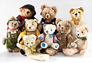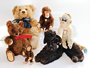 Konv., Mungo, Knopf, Schild, Reste der Fahne, Sissi, kompl., Nr. 2335.06, Jocko mit Schild, kl. Jocko, ohne Knopf u. Schild, 1 Maskenbär, neuer, 1 Replica Bär, 1902, Knopf u. Fahne, guter Zust.
