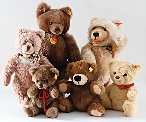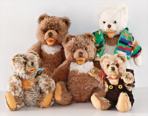 Konv. 5-tlg., Bären, 22 - 28 cm, teils mit Knopf, 2 Bären mit Knopf u. Fahne, bespielt bis guter Zust.