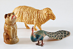 Konv. 50er u. 60er -Jahre, Hase mit Schild, kl. Schwein, kl. Huhn mit Knopf u. Fahne, Froggy, mit Schild, Schild verschlissen, 2 Hunde, schlafender Hund mit Knopf u. Fahne, Fahne verschlissen, Waldeli, Knopf, Schild u. Fahne, Nr. 7770-26, ohne Feder, ohne Gewehr, Schild verschlissen, Kläff, kompl. Nr. 1526-11, gut bis bespielt