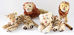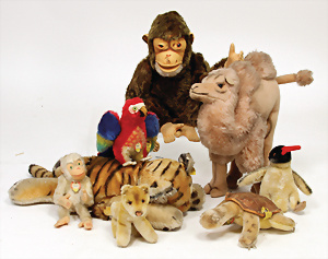 8 Teile, 1x Lora, mit Knopf, Schild u. Fahne, Nr. 1312,08, 1x Slo, Nr. 2314,00, 1x Schlaftier, Tiger, mit Knopf u. Fahne, Nr. 7828, 2x Jocko, 1x mit Knopf, ca. 25 cm, 1x mit Schild, 12 cm, dazu kl. Löwe u. Pinguin, alles bespielt