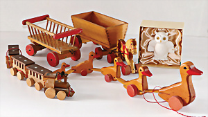 Konv. Holzspielzeug, Steiff, Steiff Pferd mit Leiterwagen, kompl., Nr. 48113.10, Flugrost an Knopf, Leiterwagen, Eisenbahn, Entenfamilie, Hersteller ?, 1 Steiff Porzellan-Figur Uhu, im Orig.-Kart.