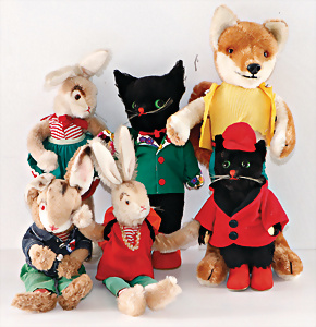 2 Kersa-Kater, 20 u. 31 cm, 1 Schlenker-Hase, wohl Schuco, 1 Hasenpaar, Schuco Biegobello, 1 Fuchs, Schuco Biegobello, guter Zust.