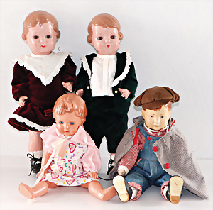 Konv. 4 Puppen, 1 Puppe wohl Bing, Stoffkopf, Stoffkörper, Kopf wohl teilw. übermalt, 2 Schildkröt Replicas, 1 Puppe Juwel, bespielt