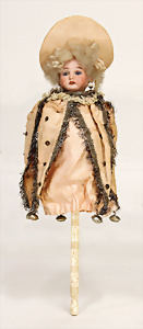 Marotte, 28 cm, Biskuit-Brustblattkopf, blaue fest eingesetzte Glasaugen, off. Mund, oben Zähne, Seidenkleidung altersbed. etwas verschlissen, Musikspielwerk intakt