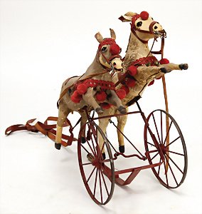 Zugspiel, mit 2 springenden Pferden, Papiermaché, H: 34 cm, ca. 1890, Leder bezogen, Fell wohl abgerieben, Glasaugen, Blech-Speichenräder, Holzstange fehlt