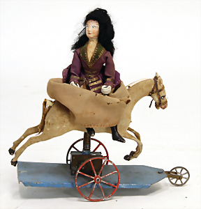 Dame auf Pferd reitend, auf dreihrädrigem Wagen, 23 cm, Pferd, Papiermaché, Ofenstaub, Masse-Dame, Wagen, Blech mit Zinnrädern, Uhrwerk defekt, Kleidung altersbed. verschlissen, Orig.-Zust., 1 Rad lose, ca. 1880, museal