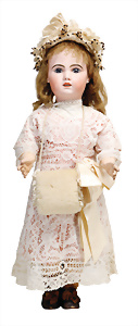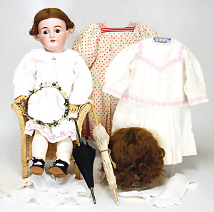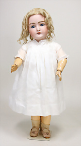 Für Jumeau, gem. Dep, 72 cm, blaue Schlafaugen, off. Mund, oben Zähne, durchst. Ohren, Kopfrand ein wenig aufgeplatzt, davon kein Riss ausgehend, franz. Gliederkörper in sehr gutem Zust., schönes altes Seidenkleid mit Spitze, Seide an ein paar Stellen altersbed. gebrochen, schöne Orig.-Echthaarperücke, alte Haube, schönes Porzellan, ausdrucksstark