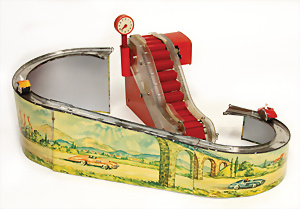 gem. SG im Kreis, Rennbahn, Blech, mit Kunststoff-Förderband, Fahrzeuge, 1x defekt, 1x gebrochen, 1x mit Klebestelle, kl. Fehlstellen an den Kunststoffteilen, Uhrwerk intakt