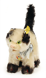 Katze, Gussy, mit Knopf u. Fahne, Nr. 6317,00, drehbarer Kopf, mit Katzenbuckel, schwarz/weiß gefleckt, 14 cm hoch, Schild mit Kugelschreiber überschrieben, sonst gut