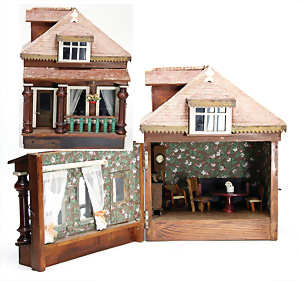 kl. Puppenstuben-Haus, Eigenbau, im Stil von Christian Hacker, ca. 1910, 33x38x31,5 cm, alte Tapete, Backsteinmuster am Dach, Fassade zum Öffnen, möbliert, schöne Größe