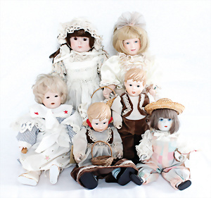 6 Porzellan Künstler-Puppen, 3x Ganzbiskuit, bewegl. Arme und Beine, 2x mit Stoffkörper, 1x mit Schild: Franklin Hairloom Doll, 1x Glieder-Körper (Wupper), Porzellan-Puppe, 23-30 cm