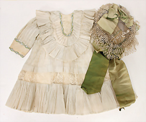 kl. Puppenkleid für franz. Bébé, für ca. 50 - 60 cm Puppe, teilw. mit Spitze u. floralem Dekor, 1 Häubchen, grüne Seide u. Papierblütenschmuck, schönes Konv.