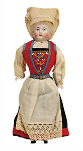 Trachtenpuppe, Biskuit-Brustblattkopf, blaue gemalte Augen, geschl. Mund, Stoffkörper, Biskuit-Arme u. -Beine, schöne Orig.-Tracht, 27 cm