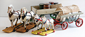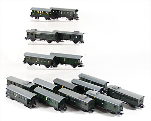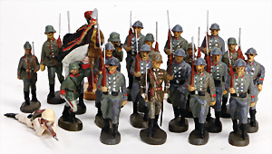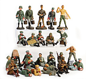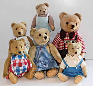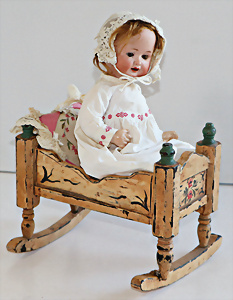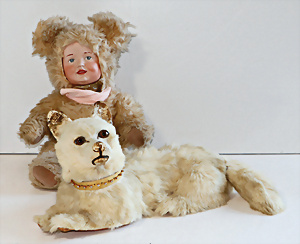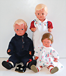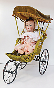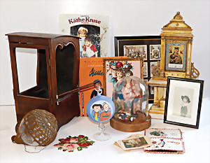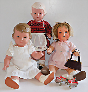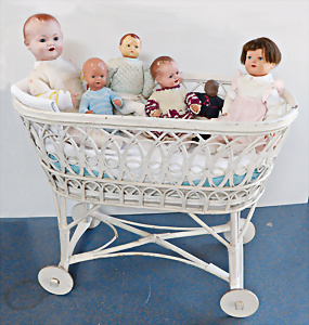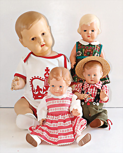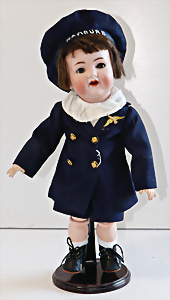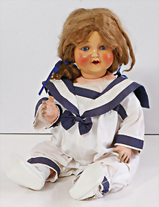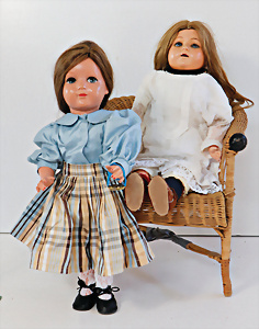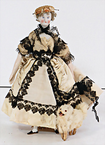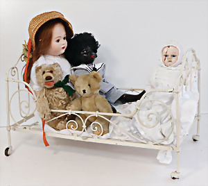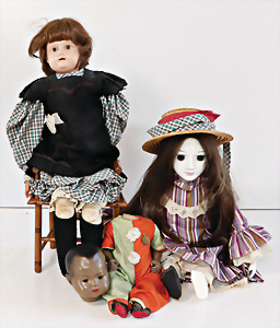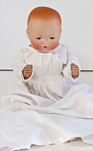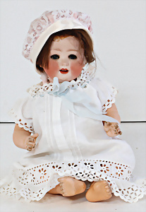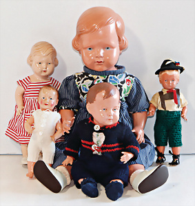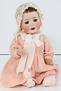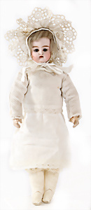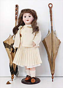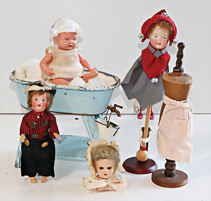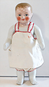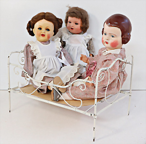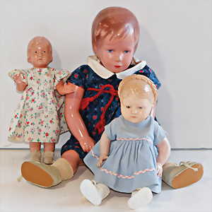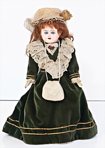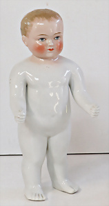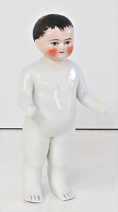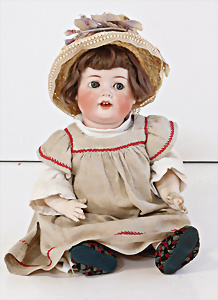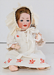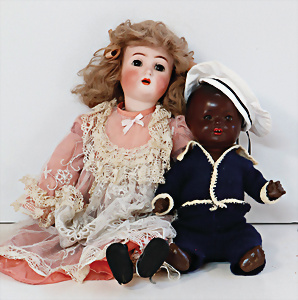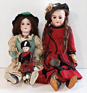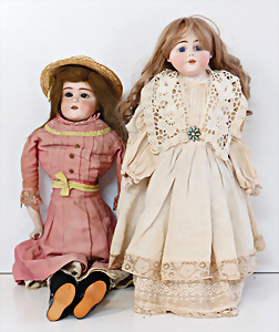 3 Porzellan-Puppen, Porzellan-Brustblattkopf-Puppe, gem. AM 3200, Haarriss am Hinterkopf, braune Schlafaugen, off. Mund, Zähne, Echthaar-Perücke, einfacher Stoffkörper, Masse-Unterarme, 65 cm, Kleidung alt oder aus alten Stoffen nachgenäht, 1x Porzellan-Puppe, gem. Germany2, blaue Schlafaugen, Wimpern, off. Mund. Zähne, Echthaar-Perücke, fest aufgeklebt, bitte Transportrisiko für den Augenmechanismus beachten, von außen keine Risse erkennbar, auf Masse-Gliederkörper, stärker bespielt, stellenw. ausgebessert u. überstrichen, 58 cm, alte Kleidung u. Unterkleidung, 1x Brustblattkopf-Kuppe, modell. Frisur, gemalte Augen, geschl. Mund, Stoffkörper, Porzellan-Arme u. -Unterschenkel mit modell. Stiefeln, 25 cm