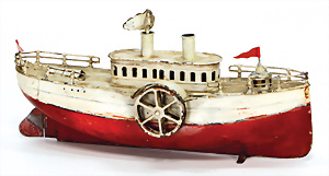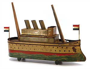 Keksdose in Schiffsform, Blech lithogr., 62 cm, Deckel über dem Kapitänsstand fehlt, Masten ergänzt (1 lose), Flugrost, ca. 1910