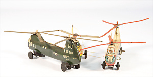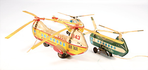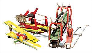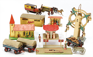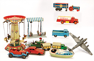 Konv. Blechspielzeug, Kettenkarussell, 1 Schiffsschaukel, 2 Kerzenboote, einige Fahrzeuge, 1 Flugzeug, Gusse, guter Zust., bespielt