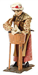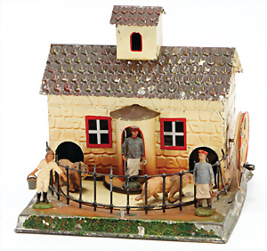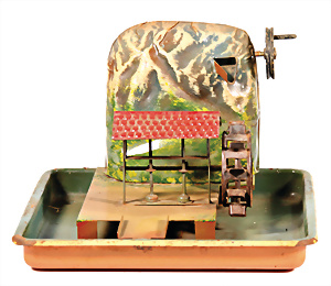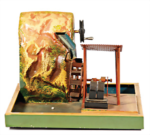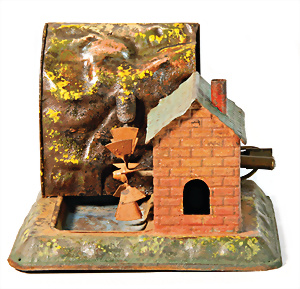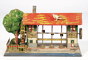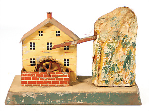 Antriebsmodell, Klopfwerk mit Wassermühle, Blech lithogr. Grundplatte 25x11 cm, bespielt, Orig.-Zust., Taube später ergänzt