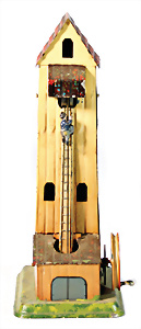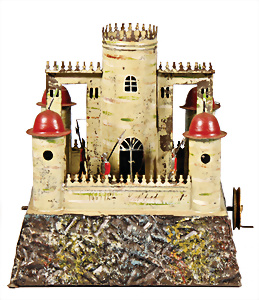 Ritterburg, Blech handlackiert, um 1900, Grundplatte 16,5 x 16,5 cm, Orig.-Zust. mit kl. Lackfehlern, Antriebsmodell