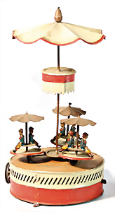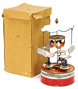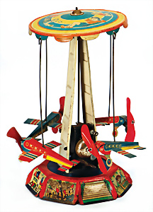 Karussell mit Luftschiffen, Blech, handlackiert, Figuren lithogr., 24 cm, guter Zust., kl. altersbed. Lackfehler, im Orig.-Kart.
