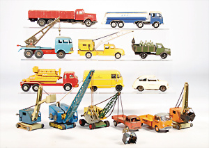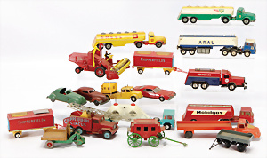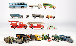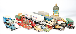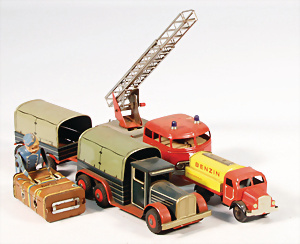 Konv. Blechspielzeug, Koffermann, Uhrwerk intakt, bespielt, LKW, 3-achsig mit Anhänger, US-Zone, 26 cm, kl. Tanklaster, 1 Feuerwehrauto, KELLERMANN