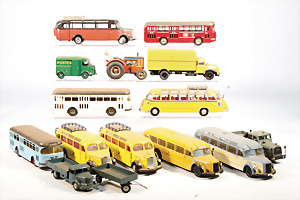 Konv. 14-tlg., LKW u. PKW, Guss, meist 1:43, GAMA, SOLIDO, TECHNO, u.a. darunter einige Zirkuswagen, bespielt - gut