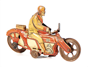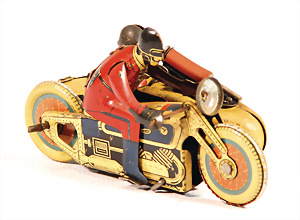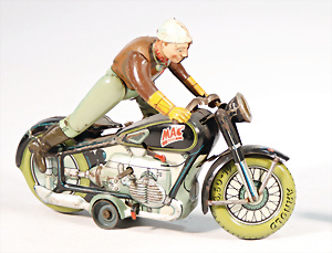 MAC 700, auf Motorrad aufsteigender Fahrer, Blech, lithogr., 19,5 cm, bespielt gut, Uhrwerk intakt