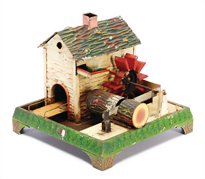 Wassermühle mit Sägewerk, Blech handlackiert, Antriebsmodell, Grundplatte 19x19 cm, bespielt, Lackfehler