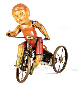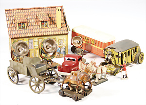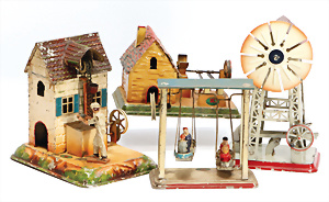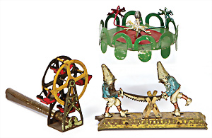 Zwerge an der Säge, Blech, lithogr., H: 6 cm, 1 Riesenrad mit Blasmechanismus, bespielt, altersbed. Lackfehler, dazu kl. Pferdekarussell, 2 Köpfe fehlen