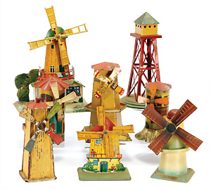 Antriebsmodell, Mühle, Blech, handlackiert, um 1900, Grundplatte 26,5x12,5, altersbed. Lackfehler, Orig.-Zust.