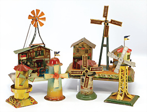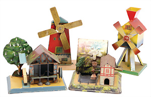 4 Teile Antriebsmodelle, Wassermühle mit Klopfwerk, Wassermühle mit Berg, 1 Windmühle, 1 Windmühle auf Holzsockel montiert, bespielt-gut