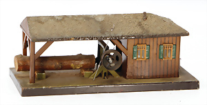 Sägewerk, Blech, handlackiert, altes MÄRKLIN-Zeichen, Grundplatte 26x12 cm, leicht bespielt, guter Zust.