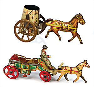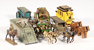 Kl. Tank, PENNY TOY, Blech lithogr., mit heraustretender Figur, 12,5 cm, guter Zust., Gulaschkanonen, Blech lithogr., Holz-Postkutsche, 1 paar Teile Zinn, 1 Reiter Masse