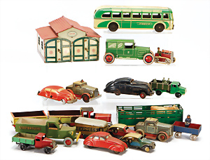 Konv. Blechspielzeug, 2 Suchscheinwerfer, MÄRKLIN, 3544, 1 Suchscheinwerfer, Blech, 1 Lastwagen HBN, 1 Gespann Blech, 1 Gespann Postkutsche Holz, 1 Gebäude jünger, bespielt-gut