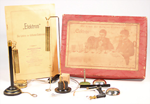 Elektro-Baukasten, "Die Lehre der Enfluenz-Elektrizität", mit Anleitungsbuch, wohl weitgehend kompl., im Orig.-Kart.