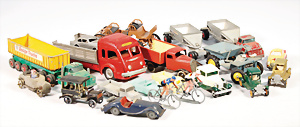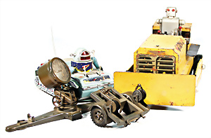 Fundkiste, Blech-Spielzeug, Fahrzeuge, Gebäude, Riesenrad, Kleinteile, untersch. Hersteller, bespielt-gut