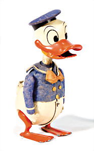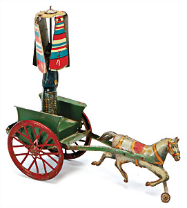 Clown auf Eselskarre, Blech, lithogr., Figur handlackiert, 1 Bein u. Ohren fehlen, Spiralfederwerk intakt, bespielt, gut