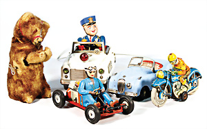 Blechspielzeug, Japan, Polzeiauto, Batterieantrieb, 24 cm, 1 MG, Batterieantrieb, Roststelle an der Bodenplatte, 1 Scheinwerfer fehlt, Batteriefach angerostet, 1 Motorradfahrer, TIPP&CO, 1 Go-Kart, SCHUCO, 1055, 1 Tanzbär wohl KARL, bespielt, gut