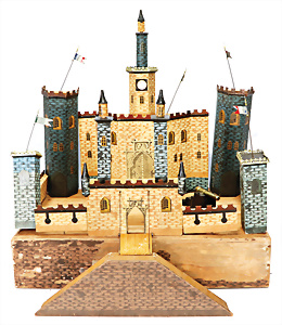 Ritterburg, Holz mit lihtogr. Papier beklebt, mit Blech-Zinnen, Blech-Fahne u. Guss-Kanone, Sockel: 62x44 cm, um 1900