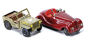 2 Teile, Examico 4001, bespielt, Uhrwerk intakt, Frontscheibe fehlt, dazu 1 Jeep, Made in Western Germany, Blech lithogr., Friktionsantrieb, 10,5 cm, guter Zust.