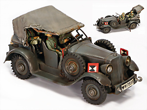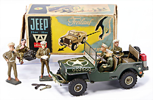 Jeep, Blech lithogr., Uhrwerk intakt, 17,5 cm, mit Figuren, verchromter Spiegel liegt lose bei, im Orig.-Kart., 1 Seitenlasche am Kart. fehlt