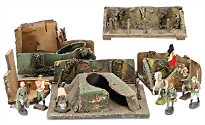 Fliegerfigur, 7 cm, Masse, 1x marschierend, 1 LINEOL Fahnenträger, 2 LINEOL Figuren Lagerleben, einige Bunker u. Schützengräben, meist guter Zust.