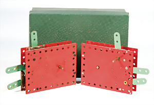 2 Teile, Uhrwerk-Motor, für Metallbaukasten, rot, 1x sehr guter Zust., im Orig.-Kart. mit Schlüssel u. Anleitung, 1x bespielter Zust., beide Uhrwerke intakt