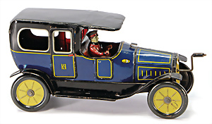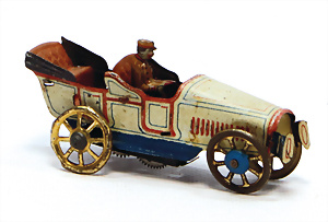 Automobil, ca. 1920, Blech, lithogr., mit Fahrerfigur, Uhrwerkantrieb (intakt), 4,5 cm, bespielt, gut