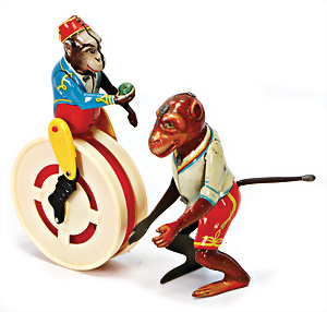 Affe auf Laufrad, Blech u. Kunststoffteile, US-Zone, 14 cm, Antrieb hakt ein wenig, sonst gut, 1 Tanz-Affe, Vorkrieg, deutsch, Blech, lithogr., Uhrwerk intakt,