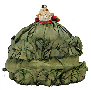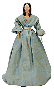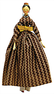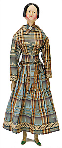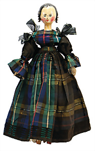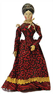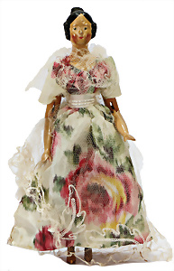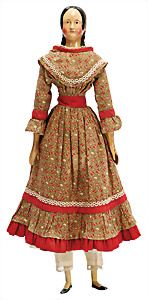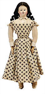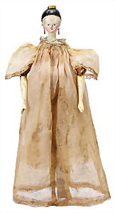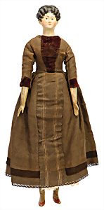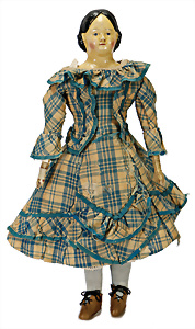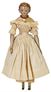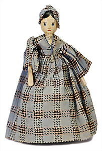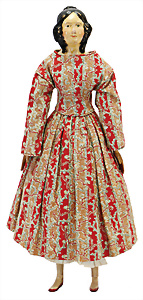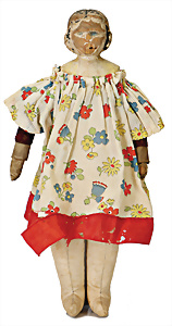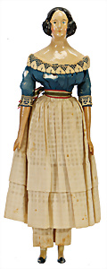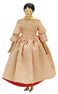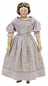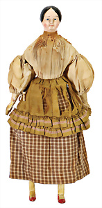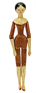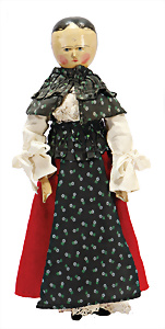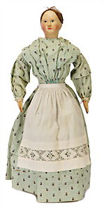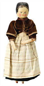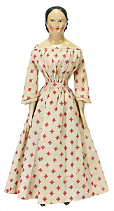 Puppe ca. 1820, geschnitzter, strenger, Rundkopf aus Hartholz. rundes geschnitztes Dekolleté mit sehr langem Hals u. guter Gesso-Schicht, geschnitztes Kinn, schöne Mundbemalung, feine, geschnitzte Stupsnase, angedeutete Ohren, Haare schwarz bemalt, einfacher Rundkopf, seitl. graue Schläfenhaare, gemalte Augen, früher, typischer, GRÖDNER-Gelenk-Körper, aus Fruchtholz mit 8 Gelenken, schlanke Taille, ausgeprägt geschnitzte Hüften, hoher runder Busen, Ellenbogen, Unterarme u. Hände mit Gesso-Schicht, gr., schön geschnitzte, spitz zulaufende Hände mit einzelnem Daumen, geschnitzte Unterschenkel mit Waden, mit Gesso-Schicht, rote Slippers, 32 cm, Kleid aus der Zeit, die Puppe stammt aus dem Museum (Of old Dolls and Toys in Winterhaven, Florida)