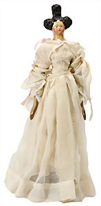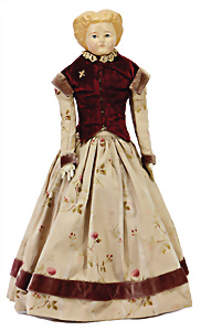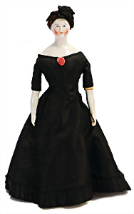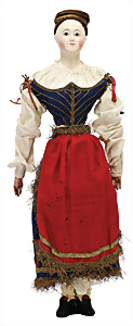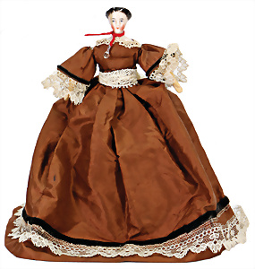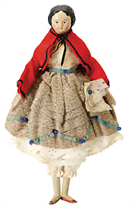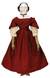 Papiermaché-Brustblattkopf-Puppe, Milliner´sModell "Adelaida", 1828, Thüringen, tiefer eckiger, Papiermaché-Brustblattkopf, das ganze Brustblatt eingefasst mit breitem, rotem, gezacktem, Papierband, als Verzierung (absolut unberührt u. orig.) modell. Busen, langer Hals, sehr sorgfältig, detaill. modell. u. gemalte Gesichtszüge, aristokratische u. stolze Haltung einer Königin, schwarze, bemalte, extrem stark modell. Haare, Mittelscheitel. flache Stirnpartie, über beiden Ohren, hohe, breite Locken-Tuffs, extrem hohe Haargebilde, aufgetürmt, 1 kl. Krone als Diadem, außergew., gemalte Augen, weißer handgenähter Ziegenleder-Körper mit sehr schlanker Taille, Arme u. Beine aus Nadelholz, 40 cm, sehr schöne, handgenähte Orig.-Kleidung einer Königin (Königin Adelaida, Frau des engl. Königs Wilhelm IV, 1830-1837), Brustblatt hinten wohl farbl. Etwas ausgebessert