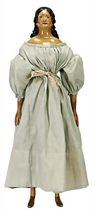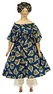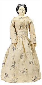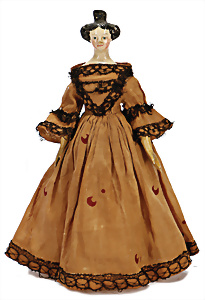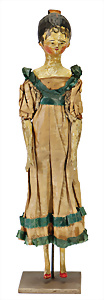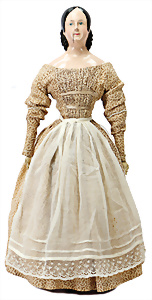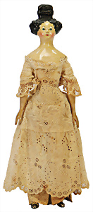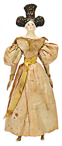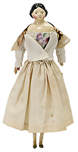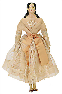 Papiermaché-Puppe, Milliner´s Model, "Bettina von Arnim", ca. 1820, Thüringen, Brustblattkopf, tiefes, breites Brustblatt mit stark modell. Busen, kurzer, stämmiger Hals, feine Gesichtszüge, modell. Ohren, stark, modell., schwarze, bemalte Haare, Mittelscheitel, das Schläfenhaar glatt gekämmt bis zu den Schläfen, nachher in Wellen hinter die Ohren in den Nacken genommen, am unteren Hinterkopf die langen off. Haare in 6 großzügigen Locken auf die Schulter fallend, gemalte Augen, weißer, handgenähter Ziegenleder-Körper, tailliert, Unterarme u. Beine aus Holz, 40 cm, mehrteilige orig., handgenähte Baumwollkleidung, Körper an einigen Stellen ausgebessert, siehe "Deutsche Papiermaché-Puppen, 1760-1860"