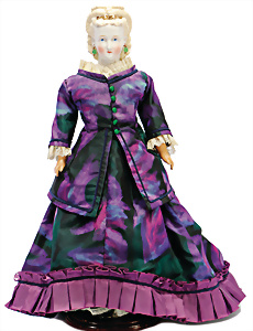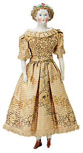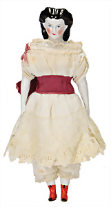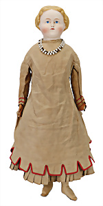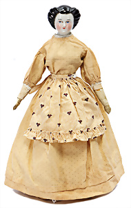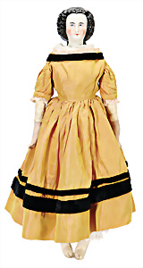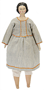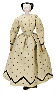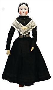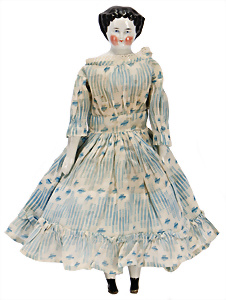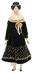 China-Head, glasiertes Porzellan, Brustblattkopf-Puppe, gr. Edeldame, 1850, wohl Kloster Veilsdorf, Brustblattkopf, eckige, kurze, schmale Brustplatte, modell. Busen, hohe Stirn, mit gemalten Pinselstrichen, gemalte ausmodell. Haare sog. Wasserfall, seitl. breite, großzügig modell. Haarrolle, biedere, bürgerl. Damenfrisur, gemalte Augen, handgenähter Körper aus Baumwollstoff, schlanke Taille, Hände aus feinem Leder, einzeln genähte Finger, 52 cm, reichh. Kleidung aus der Zeit, die Puppe hat eine außergew. ausdrucksstarke Damenfrisur, schönes frühes Porzellan in guter Erhaltung, siehe: « A pictorial Reference Guide for German Chinas, M. Gorham Krombolz, S. 132, Puppe stammt aus dem Nachlass von Estrid Faurholt (Privatsammlung)
