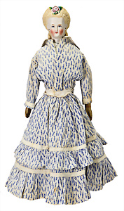 Kl. China Head (glasiertes Porzellan), Puppenstuben-Puppe, 13 cm, fein ausmodell. Haare, feine gemalte Haare als Haarkranz über dem Gesicht, schlanker, langer Hals, blaue gemalte Augen, geschl. Mund, Stoff-Körper, Holz-Arme mit aufgemalten Strumpfbändern u. kl. schwarzen Leder-Stiefeln, flache Füße, alte Kleidung oder aus alten Stoffen genäht, für frühe Puppenstube, 1840