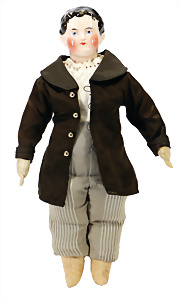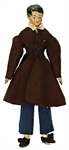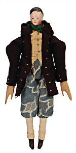 Außergew. Puppenstuben-Puppe, ca. 1850, 16,5 cm, Mann, Papiermaché-Brustblattkopf, fein gemalte Haare, gemalte Augen, geschl. Mund, gegliederter Holz-Körper mit geraden Armen, geschnitzte lange Finger, separater Daumen, Orig.-Kleidung, schöne Gr. für eine frühe Puppenstube